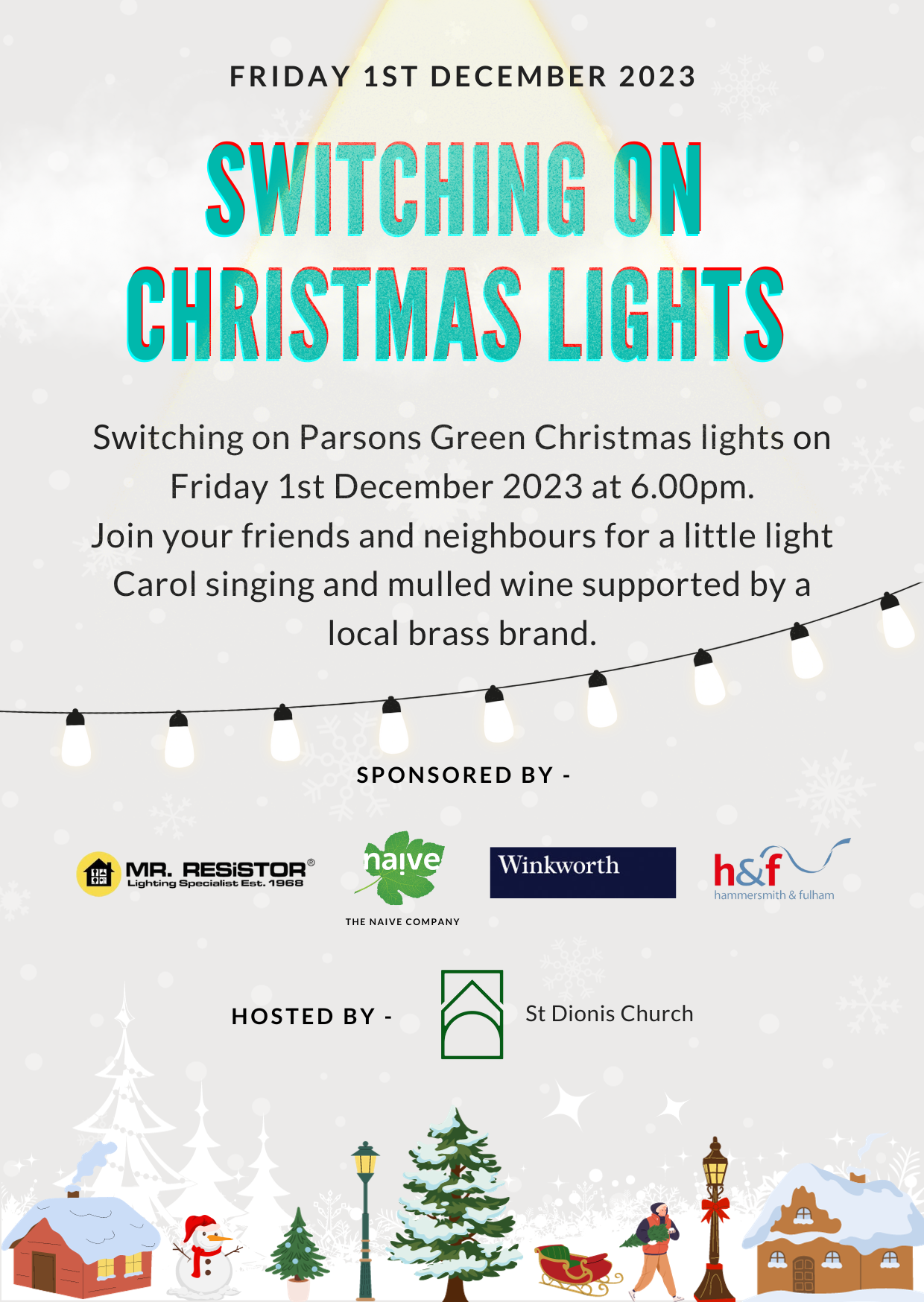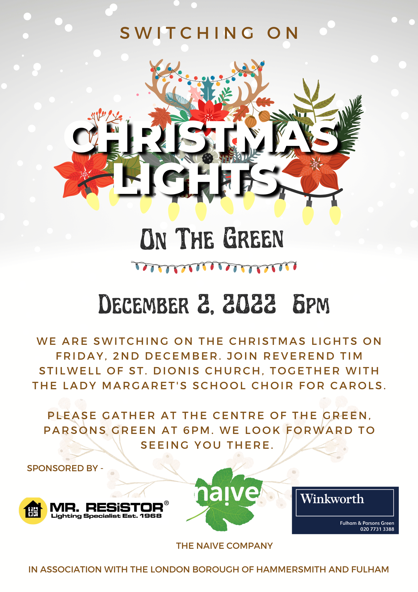 We are switiching on the Christmas Lights on Friday, 1st December. Please gather at the centre of the green, Parsons Green at 6pm. We look forward to seeing you there!